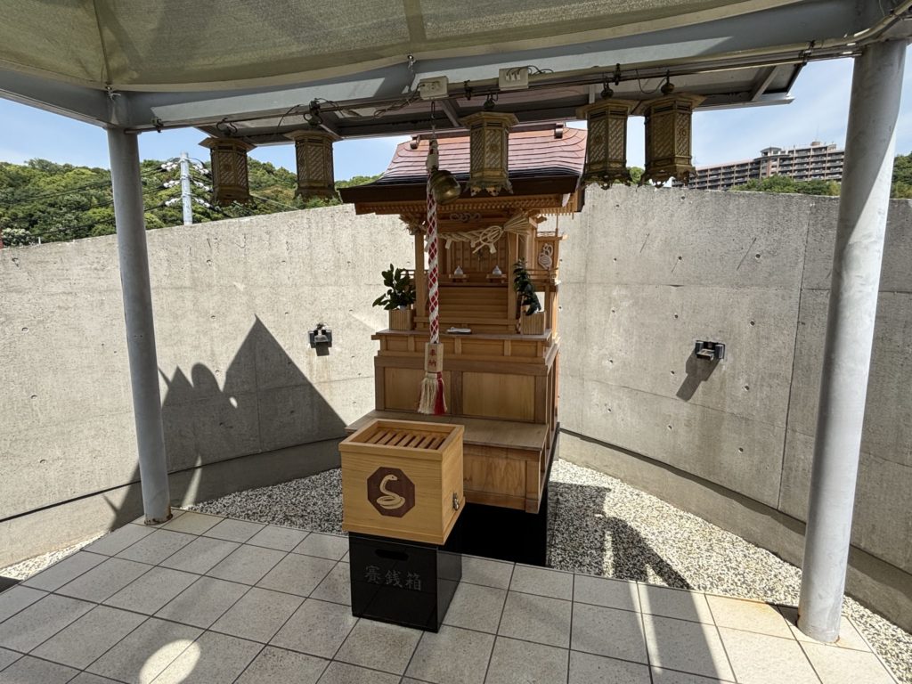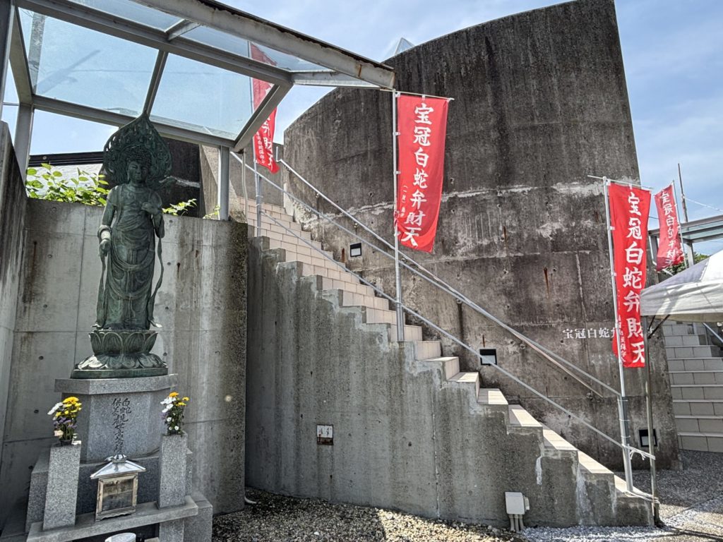 白蛇神社の境内はコンパクトながら、白蛇を象った石像やお守り、御神体展示などが点在し、金運アップへのご利益を実感できる空間です。