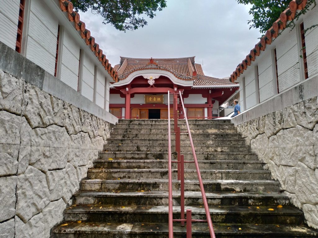 境内には立派な本堂と石造りの階段があり、那覇市内を見下ろす高台に位置しています。朝夕の参拝は特に清々しく、地元の人々の散歩コースにもなっています。