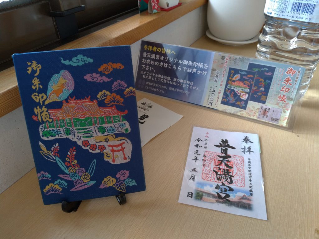 普天満宮の御朱印は、力強い筆致で「普天満宮」と記され、中央には美しい朱印が押されています。御朱印は授与所でいただくことができ、書き置き対応も行っていますが、タイミングが合えば直書きも可能です。