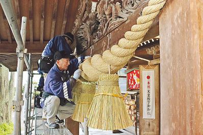 井波の高瀬神社 重さ約100キロの、しめ縄張り替え丁寧に
